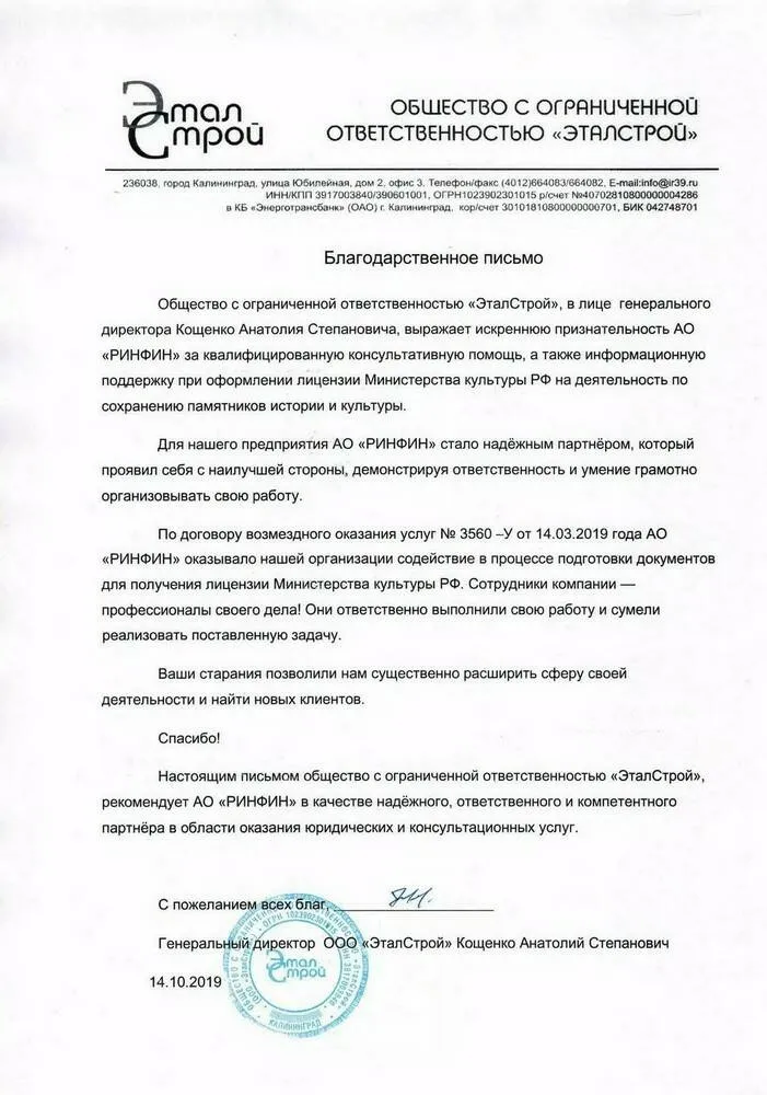 Общество с ограниченной ответственностью «ЭталСтрой», в лице генерального директора Кощенко Анатолия Степановича, выражает искреннюю признательность АО «РИНФИН» за квалифицированную консультативную помощь, а также информационную поддержку при оформлении лицензии Министерства культуры РФ на деятельность по сохранению памятников истории и культуры.