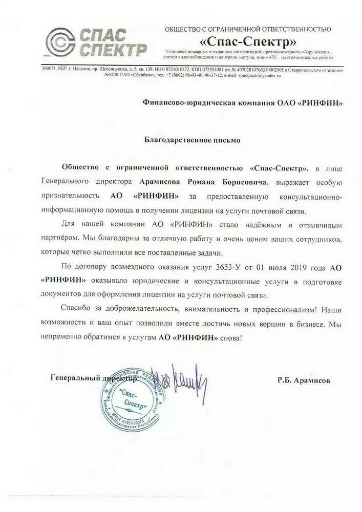 Общество с ограниченной ответственностью «Спас-Спектр». в лице Генерального директора Арамисова Романа Борисовича, выражает особую признательность АО «РИНФИН» за предоставленную консультационно- информационную помощь в получении лицензии на услуги почтовой связи.