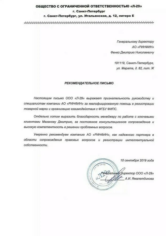 Настоящим письмо ООО «Л-29» выражает признательность руководству и специалистам компании АО «РИНФИН» за квалифицированную помощь в регистрации товарной марки и организацию взаимодействия с ФГБУ «ФИПС».