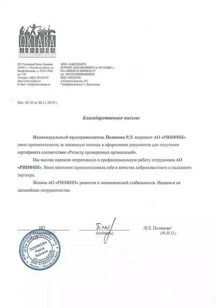 Индивидуальный предприниматель Полякова Р.Л. выражает АО «РИНФИН» свою признательность за оказанную помощь в оформлении документов для получения сертификата соответствия «Регистр проверенных организаций».