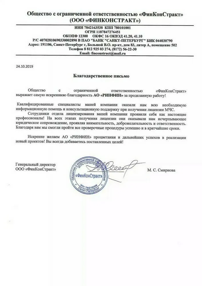 Общество с ограниченной ответственностью «ФинКонСтракт» выражает самую искреннюю благодарность АО «РИНФИНУ» за проделанную работу!
