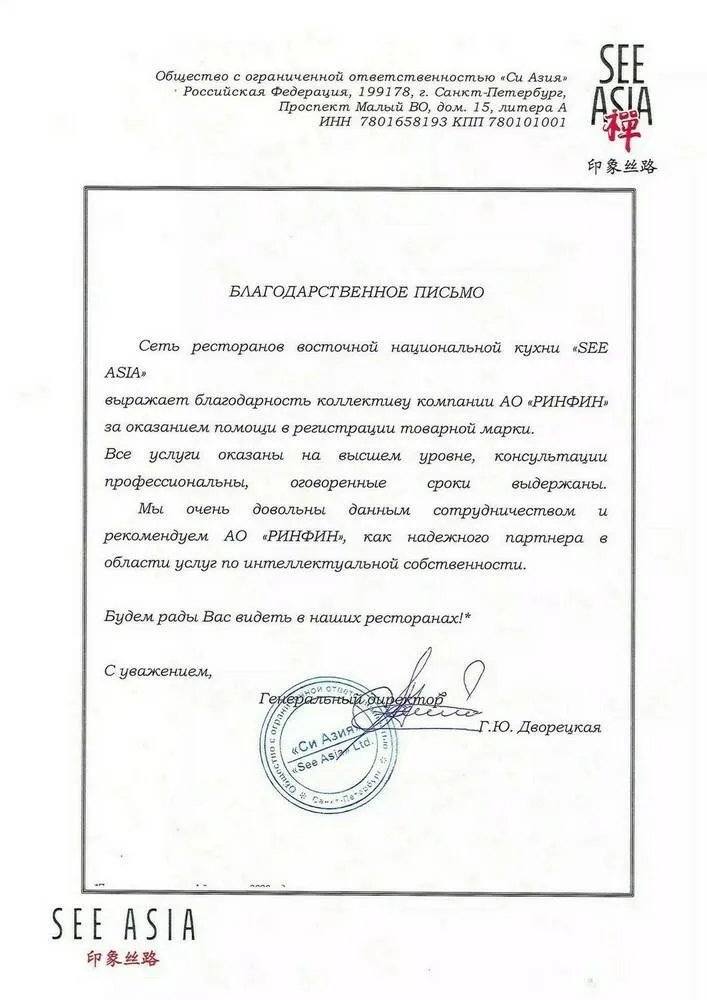 Сеть ресторанов восточной национальной кухни «See Asia» выражает благодарность коллективу компании АО «РИНФИН» за оказанием помощи в регистрации товарной марки.