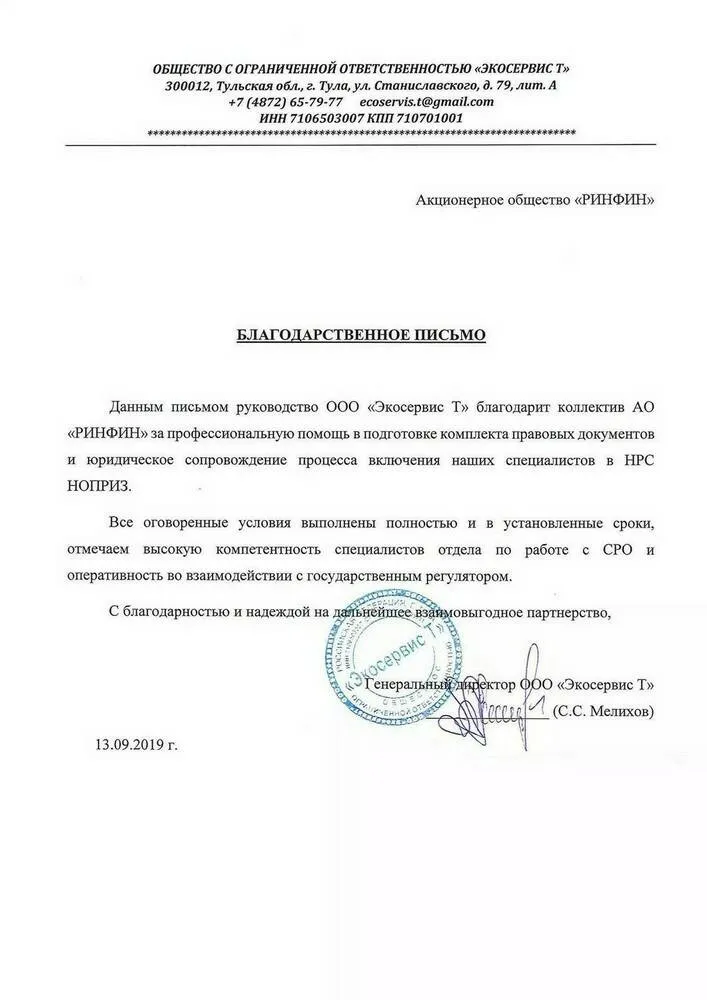 Данным письмом руководство ООО «Экосервис Т» благодарит коллектив АО «РИНФИН» за профессиональную помощь в подготовке комплекта правовых документов и юридическое сопровождение процесса включения наших специалистов в НРС НОПРИЗ.
