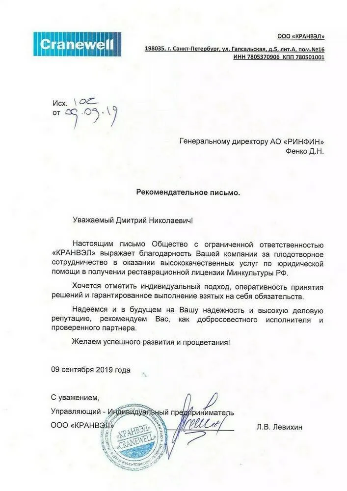 Уважаемый Дмитрий Николаевич! Настоящим письмо Общество с ограниченной ответственностью «КРАНВЭЛ» выражает благодарность Вашей компании за плодотворное сотрудничество в оказании высококачественных услуг по юридической помощи в получении реставрационной лицензии Минкультуры РФ.