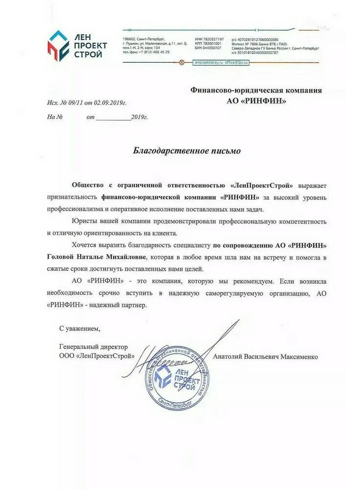 Общество с ограниченной ответственностью «ЛенПроектСтрой» выражает признательность финансово-юридической компании АО «РИНФИН» за высокий уровень профессионализма и оперативное исполнение поставленных нами задач.