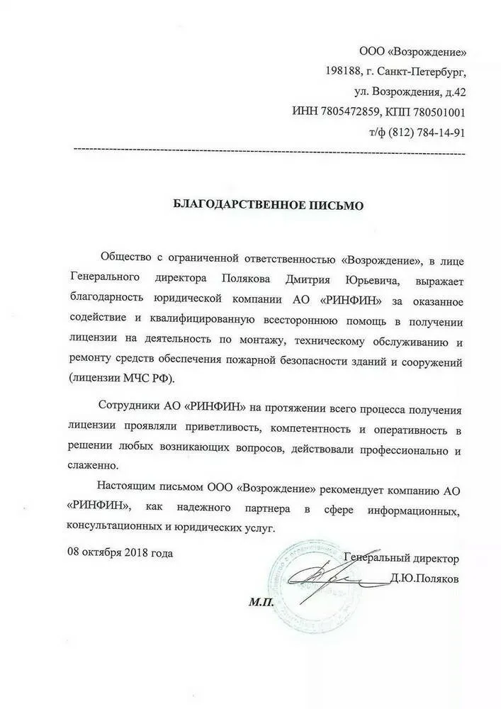 Общество с ограниченной ответственностью «Возрождение», в лице Генерального директора Полякова Дмитрия Юрьевича, выражает благодарность юридической компании АО «РИНФИН» за оказанное содействие и квалифицированную всестороннюю помощь в получении лицензии на деятельность по монтажу, техническому обслуживанию и ремонту средств обеспечения пожарной безопасности зданий и сооружений (лицензии МЧС РФ).