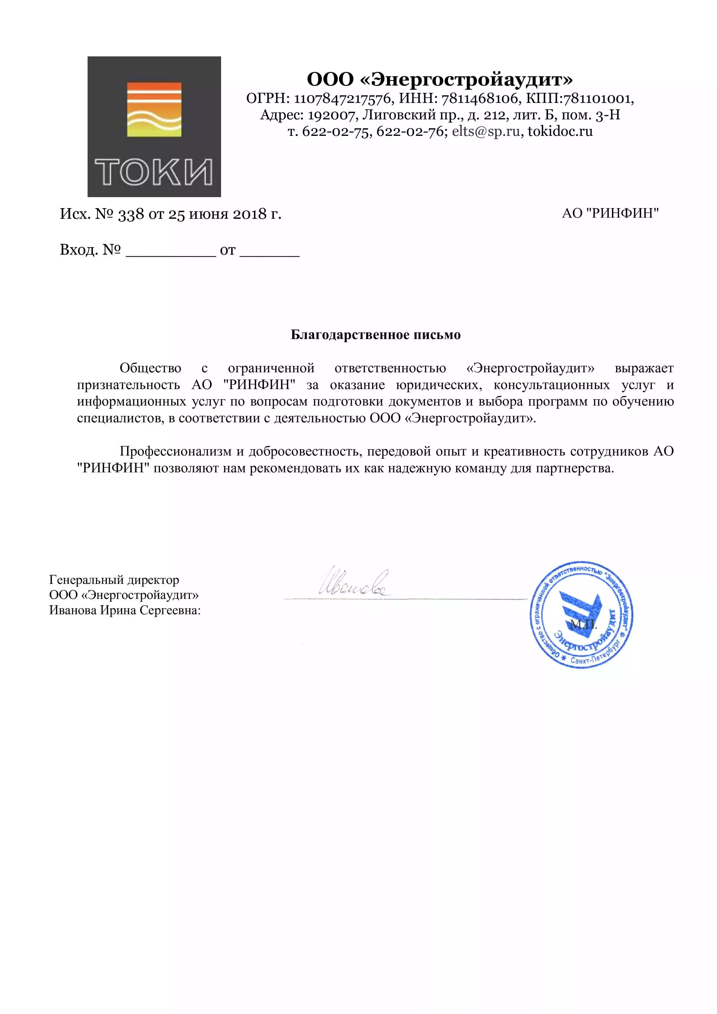 Общество с ограниченной ответственностью «Энергостройаудит» выражает признательность АО «РИНФИН» за оказание юридических, консультационных услуг и информационных услуг по вопросам подготовки документов и выбора программ по обучению специалистов, в соответствии с деятельностью ООО «Энергостройаудит».