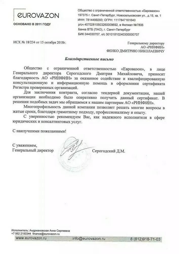 Общество с ограниченной ответственностью «Евровазон», в лице Генерального директора Серогодского Дмитрия Михайловича, приносит благодарность АО «РИНФИН» за оказанное содействие и квалифицированную консультационную и информационную помощь в оформлении сертификата Регистра проверенных организаций.