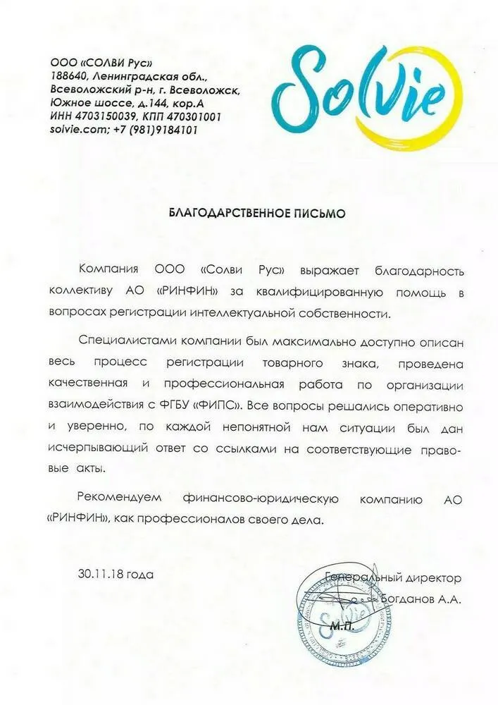 Компания ООО «Солви Рус» выражает благодарность коллективу АО «РИНФИН» за квалифицированную помощь в вопросах регистрации интеллектуальной собственности.