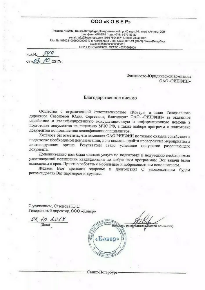 Общество с ограниченной ответственностью «Ковер», в лице Генерального директора Сазоновой Юлии Сергеевны, благодарит АО «РИНФИН» за оказанное содействие и квалифицированную консультационную и информационную помощь в подготовке документов на лицензию МЧС РФ, а также выборе программ и подготовке документов по повышению квалификации специалистов.