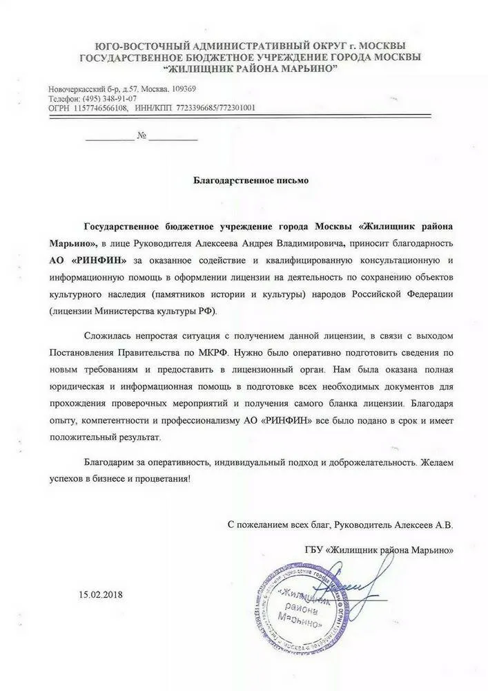Государственное бюджетное учреждение города Москвы «Жилищник района Марьино», в лице Руководителя Алексеева Андрея Владимировича, приносит благодарность A0 «РИНФИН» за оказанное содействие и квалифицированную консультационную и информационную помощь в оформлении лицензии на деятельность по сохранению объектов культурного наследия (памятников истории и культуры) народов Российской Федерации (лицензии Министерства культуры РФ).
