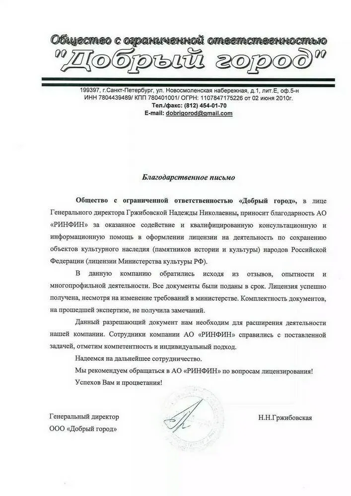 Общество с ограниченной ответственностью «Добрый город», в лице Генерального директора Гржибовской Надежды Николаевны, приносит благодарность АО «РИНФИН» за оказанное содействие и квалифицированную консультационную и информационную помощь в оформлении лицензии на деятельность по сохранению объектов культурного наследия (памятников истории и культуры) народов Российской Федерации (лицензии Министерства культуры РФ).
