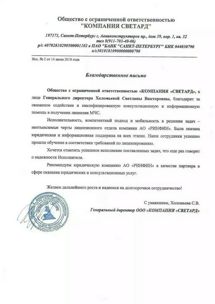 Общество с ограниченной ответственностью «КОМПАНИЯ «СВЕТАРД», в лице Генерального директора Холомьевой Светланы Викторовны, благодарит за оказанное содействие и квалифицированную консультационную и информационную помощь в получении лицензии МЧС.