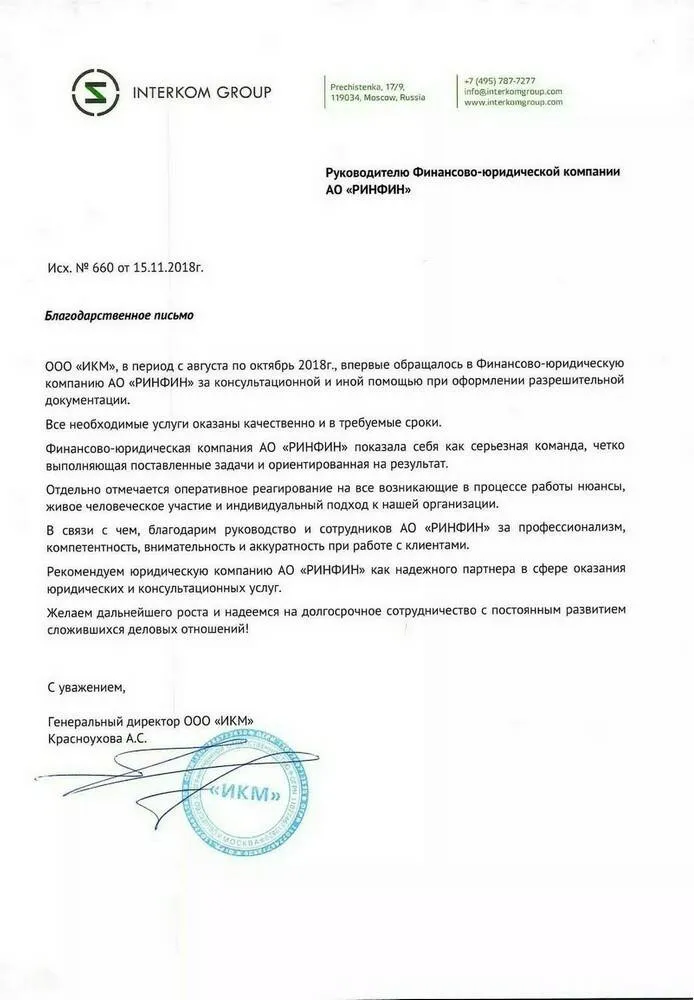 В связи с чем благодарим руководство и сотрудников АО «РИНФИН» за профессионализм, компетентность, внимательность и аккуратность при работе с клиентами.