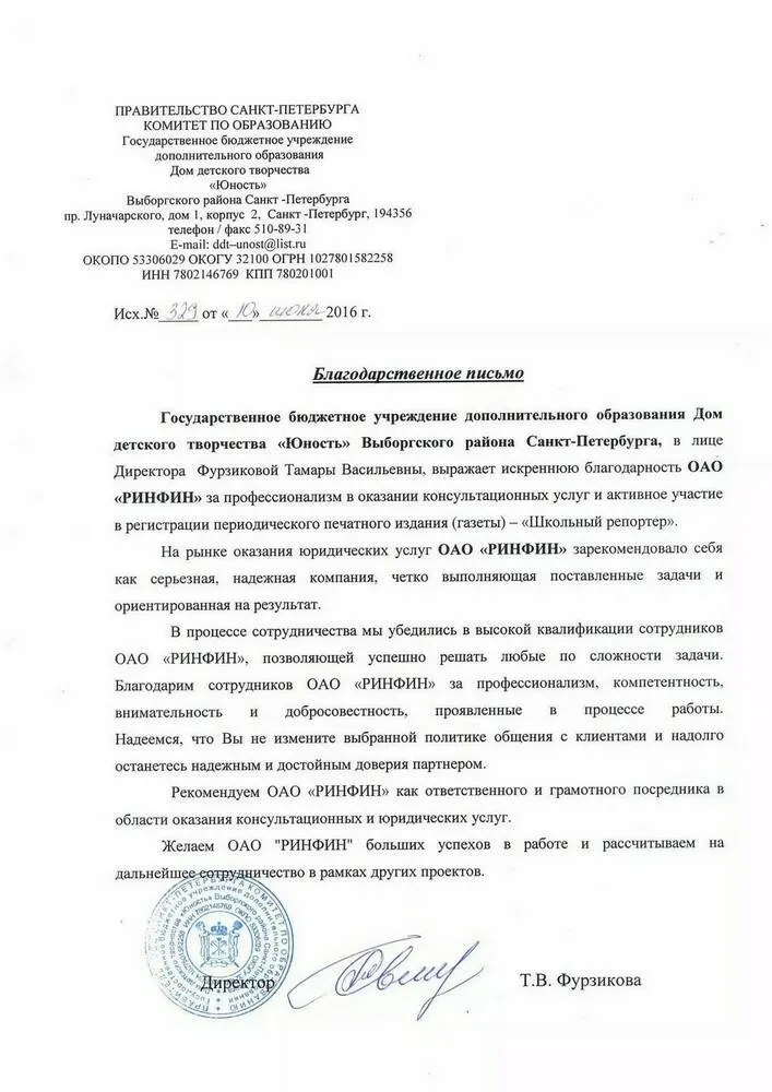 Государственное бюджетное учреждение дополнительного образования Дом детского творчества «Юность» Выборгского района Санкт-Петербурга, в лице директора Фурзиковой Тамары Васильевны, выражает искреннюю благодарность АО «РИНФИН» за профессионализм в оказании консультационных услуг и активное участие в регистрации периодического печатного издания (газеты) — «Школьный репортер».