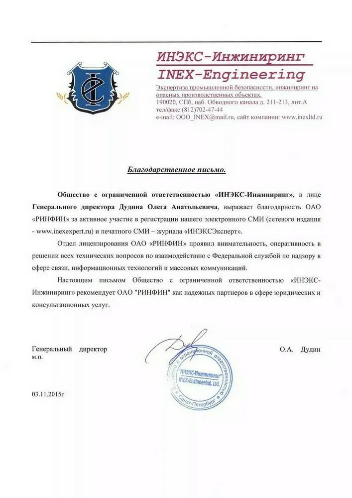 Общество с ограниченной ответственностью «ИНЭКС-Инжиниринг», в лице Генерального директора Дудина Олега Анатольевича, выражает благодарность АО «РИНФИН» за активное участие в регистрации нашего электронного СМИ (сетевого издания — www.inexexpert.ru) и печатного СМИ — журнала «ИНЭКСЭксперт».