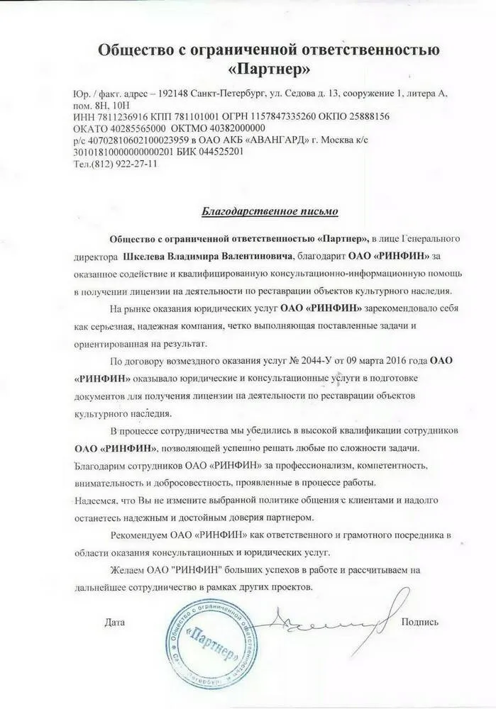 Общество с ограниченной ответственностью «Партнер», в лице Генерального директора Шкелева Владимира Валентиновича, благодарит АО «РИНФИН» за оказанное содействие и квалифицированную консультационно-информационную помощь в получении лицензии на деятельность по реставрации объектов культурного наследия.