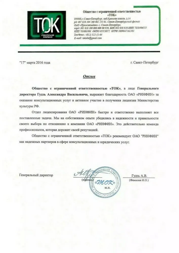 Общество с ограниченной ответственностью «ТОК», в лице Генерального директора Гудзь Александра Васильевича, выражает благодарность ОАО «РИНФИН, за оказание консультационных услуг и активное участие в получении лицензии Министерства культуры РФ.