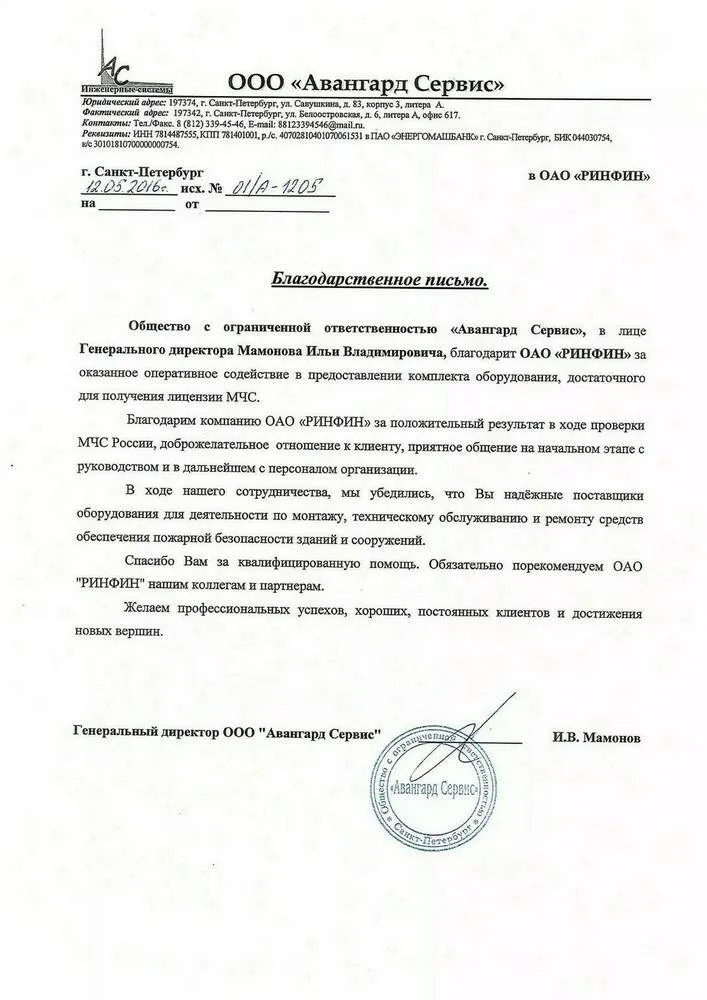 Общество с ограниченной ответственностью «Авангард Сервис», в лице Генерального директора Мамонова Ильи Владимировича, благодарит АО «РИНФИН» за оказанное оперативное содействие в предоставлении комплекта оборудования, достаточного для получения лицензии МЧС.