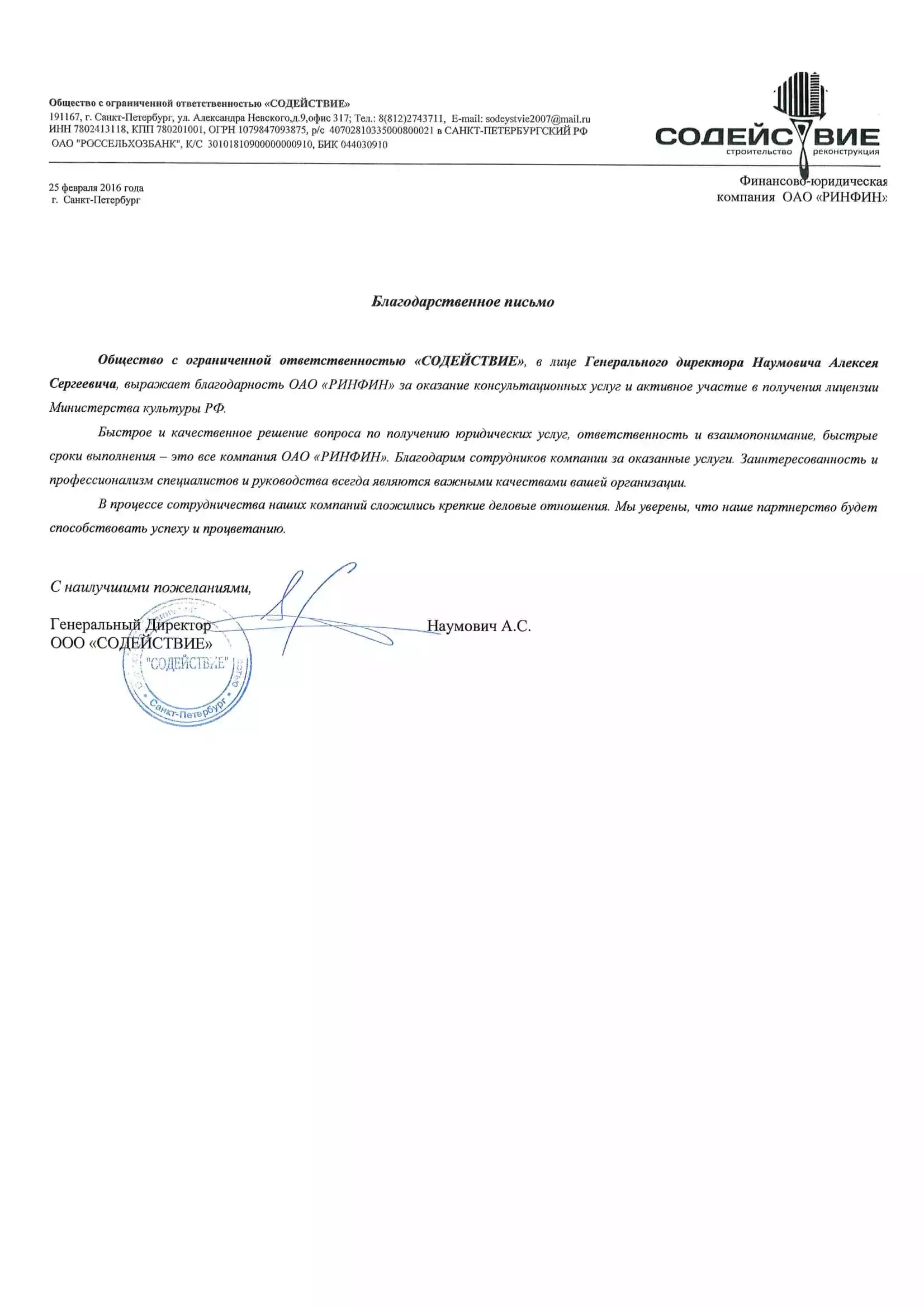 Общество с ограниченной ответственностью «СОДЕЙСТВИЕ», в лице Генерального директора Наумовича Алексея Сергеевича, выражает благодарность ОАО «РИНФИНУ» за оказание консультационных услуг и активное участие в получении лицензии Министерства культуры РФ.