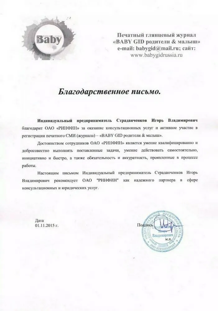 Индивидуальный предприниматель Страданченков Игорь Владимирович благодарит АО «РИНФИН» зa оказание консультационных услуг и активное участие в регистрации печатного СМИ (журнала) — «BABY GID родители & малыш».